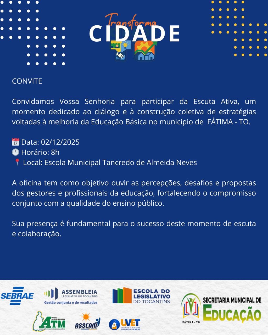 O município de Fátima, no Tocantins, sediará na manhã desta terça-feira, 02 de dezembro de 2025, uma importante etapa do programa Transforma Cidade. O evento, denominado "Escuta Ativa", tem como foco o diálogo e a construção coletiva de soluções para a Educação Básica local.